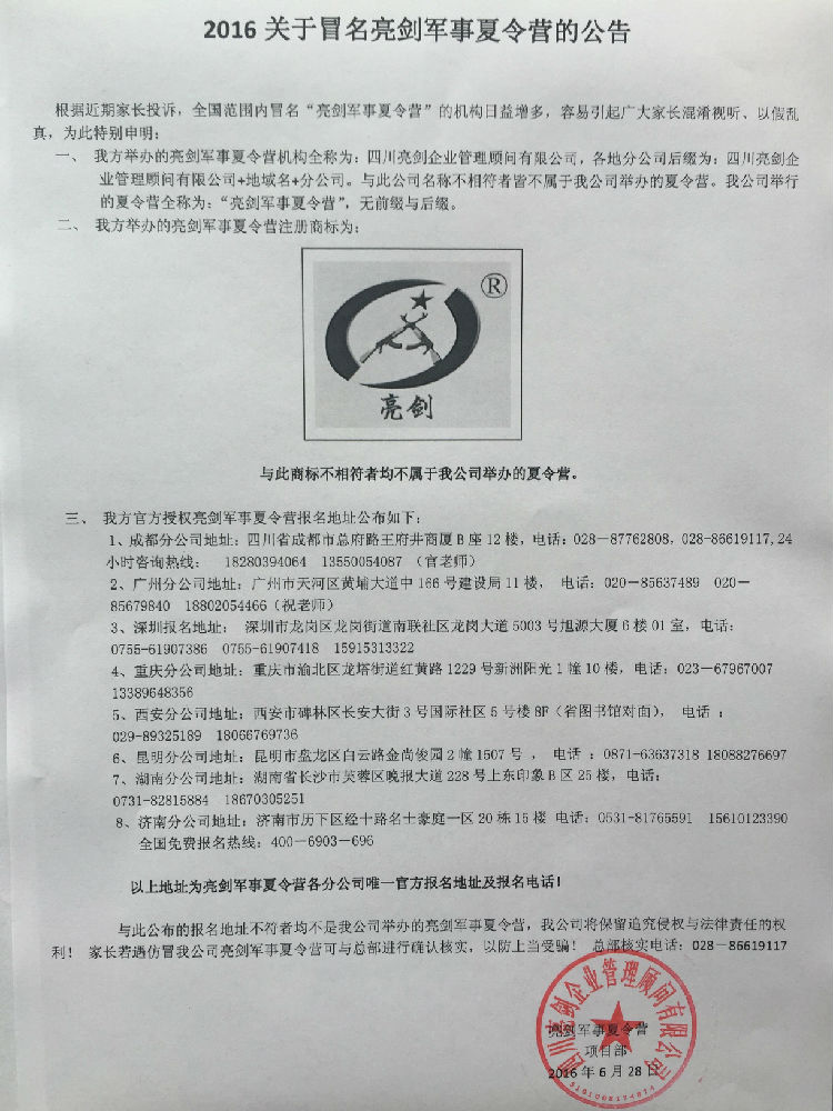 2016关于冒名亮剑军事夏令营的公告